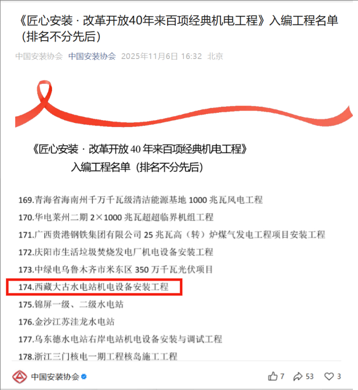本网西藏消息(石梦芸 报道)11月14日获悉,西藏大古水电站机电设备安装工程成功入选中国安装协会评选的《匠心安装·改革开放40年来百项经典机电工程》入编名单。 大古水电站是中央支持西藏经济社会发展的重大项目,是雅鲁藏布江中游八级开发的第二个梯级,总装机 660兆瓦。是西藏单机容量最大和总装机容量最大电站,同时也是西藏首个以500千伏接入藏中电网的电站。设计年发电量可达32亿千瓦时,约占西藏全社会用电量的三分之一,对保障西藏电力供应、优化能源结构具有重要战略意义。 工程攻克3450米高海拔焊接、31℃大温差高精组装、高原大机组调试经验空白等难题,创新工艺工法,实现机组安装质量国内领先,创雪域高原大型水电站“一年四投 当年全投”纪录。树立雅江中游大型水电站机组高质量、高速度投产典范,多项先进技术和研究成果可应用于同类型水电站开发建设。 此项目此次成功入选,是继取得"雪莲杯"、"安装之星"、"国家优质工程金奖"之后的又一殊荣。这不仅是企业技术实力、创新能力与匠心精神的集中彰显,更是对七局安装在机电设备安装领域精益求精的最好嘉奖与肯定。 |