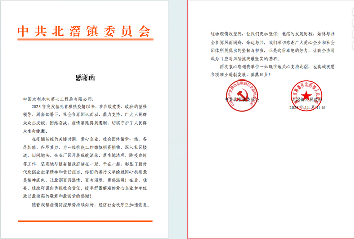本网佛山消息(刘翌曦 报道)11月11日,水电七局佛山项目群收到佛山市顺德区北滘镇人民政府发来的感谢函,对项目在基孔肯雅热疫情防控志愿服务中主动担当、积极作为,助力属地筑牢防疫屏障表达感谢。 据悉,水电七局在防疫紧要关头,尽其所能、倾力相助,与镇委镇政府同心同向、并肩作战,充分展现新时代央企的社会责任与使命担当。在疫情防控关键阶段,项目部迅速响应、高效组织,组建志愿者队伍投身防控一线,深入社区楼道协助开展蚊虫消杀、清理孳生地、加强防疫宣传等工作,为阻断疫情传播、保障群众健康提供了有力支持。 南方分公司一直积极履行社会责任,以务实成效彰显了央企的服务本色。在之后的工作中项目部将继续秉持央企担当,全力守护人民群众健康安全,为属地的高质量发展和长治久安持续贡献力量。 感谢函 |