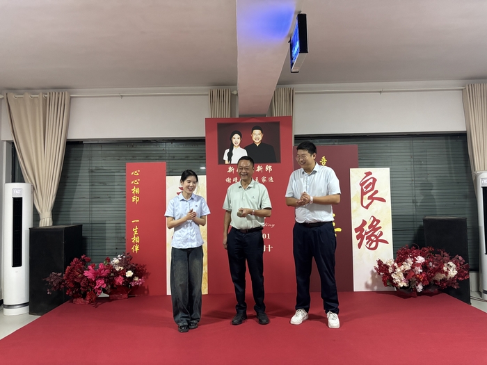本网怀化消息(谢瑾佳 报道)10月1日,水电七局辰溪抽蓄项目部举办了一场简单却温馨的工地婚礼。 这对新人原定婚礼因项目工期紧张一再推迟。了解情况后,项目部主动牵头,精心策划,将职工食堂装点得格外温馨。员工们自发轮流担任摄影师、主持人,还特意准备了祝福贺卡。仪式上,这对新人穿着整洁的工装携手入场,经过简单的征婚后,新人在同事们的见证下互换戒指,许下誓言。热情相拥。这对新人表示,会带着项目部的祝福,继续为项目建设贡献力量。 这场朴素的工地婚礼,没有奢华排场,却让项目部的凝聚力悄然升温。这份承载着共同付出、共同祝福的情感,正转化为推动项目上下一心、共同前进的动力。(责任编辑 黄灿) 仪式现场新婚夫妇(谢瑾佳及王佳逸)及新郎父 |