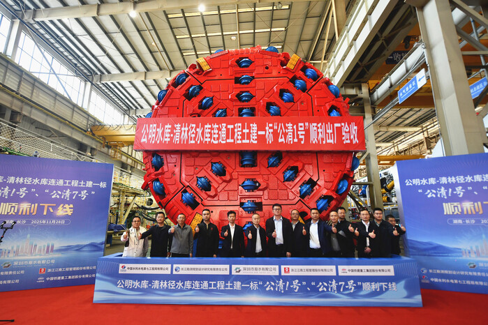 本网深圳消息(杜志明 报道)近日,“公清1号”双护盾TBM与“公清7号”复合式土压平衡盾构机在长沙下线,标志着水电七局承建的深圳公明水库—清林径水库连通工程土建一标段顺利转序输水隧洞施工。 “公清1号”TBM开挖直径6.73米,总长约190米,总重约1350吨。针对本工程的地质特点,“公清1号”配置了高结构强度、高耐磨性能的硬岩刀盘以及高可靠性长使用寿命主驱动系统,以应对超长距离掘进工况,为TBM快速安全掘进提供了有力保障。“公清7号”复合式土压平衡盾构机开挖直径3.76米,总长约125米,总重约330吨。“公清7号”针对华南极硬岩地层设计小刀间距重载复合刀盘,对刀盘和螺旋机等关键部件做针对性加强耐磨设计;盾体配置的主动铰接具备更灵活的姿态调节能力,同时整机具备超大推力和扭矩储备,可以有效应对各种复杂地质和工况,实现快速全断面掘进。 项目开工之初就组建专职部门及管理人员,参建各方与设备建造方共同建立TBM和盾构机研发团队,深入研究国内外大直径硬岩掘进机设计和施工案例,并多次共同深入工地现场开展实勘与研讨交流,为产品按期顺利下线提供了基础保障,成功完成本工程双护盾TBM的设计与制造,顺利实现两台“地下蛟龙”问世。(责任编辑 洪若涛) “公清1号”下线现场 |