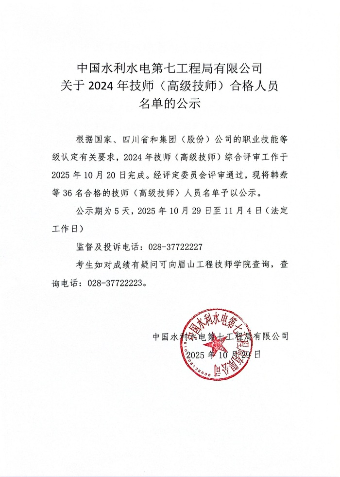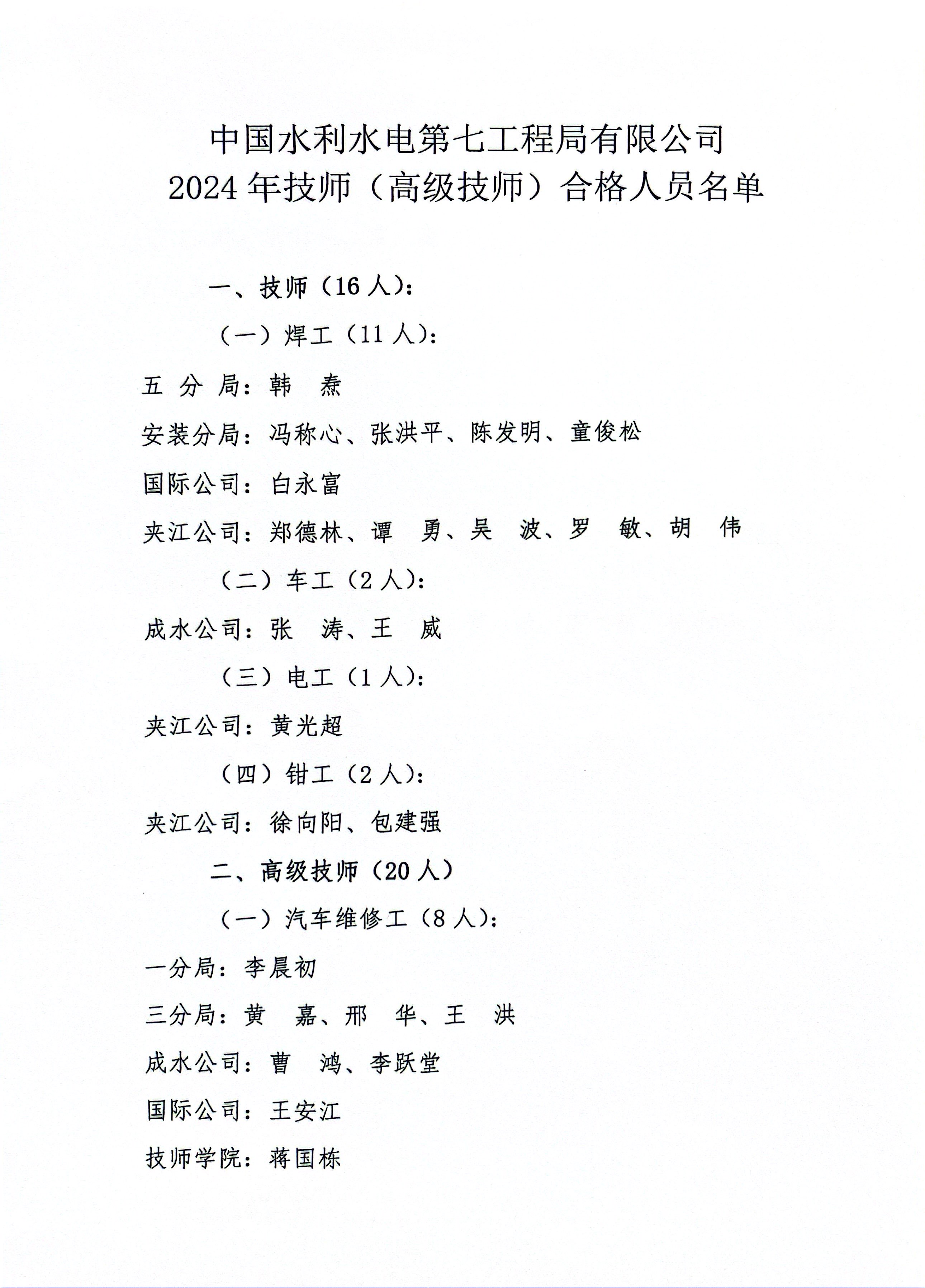 中国水利水电第七工程局有限公司关于2024年技师(高级技师)合格人员名单的公示