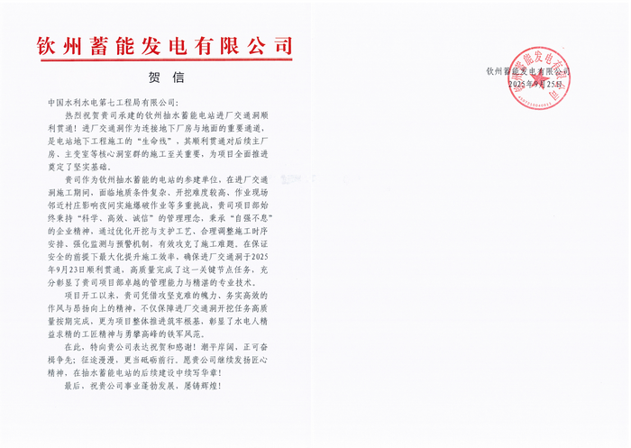 本网钦州消息(曹依伦 报道)10月3日,从水电七局广西钦州灵山抽水蓄能电站项目部获悉,收到业主贺信,对项目部顺利完成电站进厂交通洞开挖施工,表示高度肯定和赞扬。 信中表示,项目部通过优化开挖与支护工艺、合理调整施工时序安排、强化监测与预警机制,有效攻克了施工难题。在保证安全的前提下最大化提升施工效率,确保进厂交通洞于2025年9月23日顺利贯通,高质量完成了这一关键节点任务,充分彰显了贵司项目部卓越的管理能力与精湛的专业技术。 广西钦州灵山抽水蓄能电站进厂交通洞全长1415.78米,是连接地下厂房与地面的重要通道,其顺利贯通对后续主厂房、主变室等核心洞室群的施工至关重要,为项目全面推进奠定了坚实基础。(责任编辑 黄琪) |