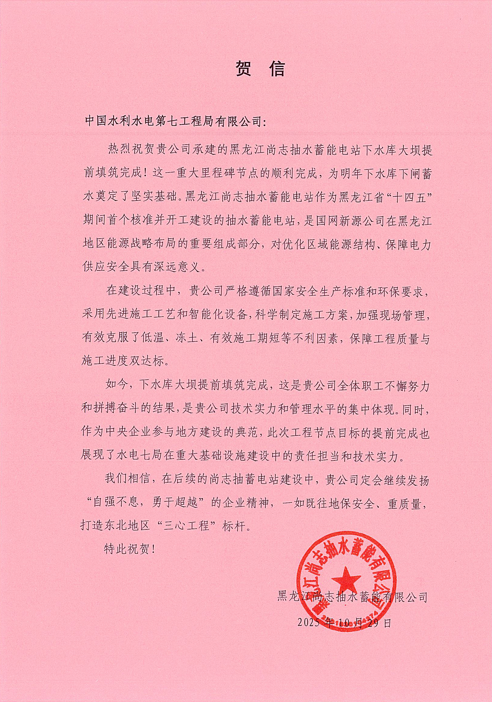 本网尚志消息(彭祥伟 报道)10月29日,水电七局尚志项目获业主贺信,对提前完成下水库大坝填筑目标任务给予高度赞扬。 贺信指出:尚志抽蓄电站是黑龙江省“十四五”首个核准开工的抽水蓄能电站,大坝作为核心控制性工程,提前填筑完成为明年下闸蓄水奠定了基础。建设过程中,项目团队充分发挥管理与技术优势,科学制定施工方案,克服严寒、冻土、料源紧缺等困难,实现质量进度双达标,展现了水电七局在重大基础设施建设中的责任担当和技术实力。 尚志项目表示,将以贺信为激励,继续秉持“自强不息,勇于超越”的企业精神,严格贯彻业主“打造精品工程”的要求,全力推进后续施工任务,确保电站如期投产发电。(责任编辑 龚海依)