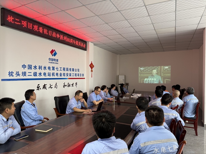 本网乐山消息(杨宏健 报道)9月3日,枕头坝二级项目集中观看纪念中国人民抗日战争暨世界反法西斯战争胜利80周年大会。