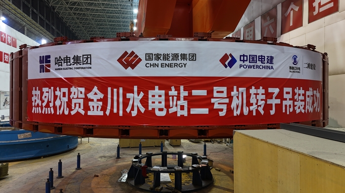 本网阿坝消息(代舒羽 报道)10月16日,金川水电站第三台机组(2号机组)转子吊装就位。