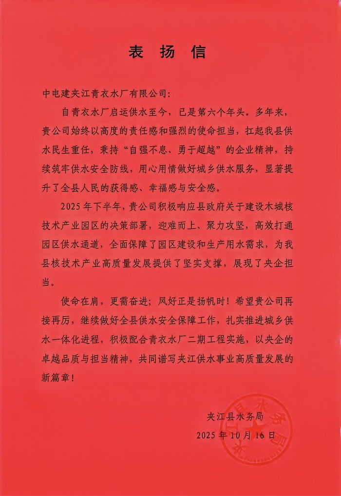 本网夹江消息(杨蕊菡 报道)10月16日,夹江青衣水厂收到了夹江县水务局发来的表扬信,对青衣水厂六年来在保障城乡供水安全、提升民生服务品质方面作出的贡献表示肯定。 信中指出,青衣水厂作为全县民生供水的核心力量,六年来始终秉持“自强不息、勇于超越”的精神,持续筑牢供水安全防线,用心用情做好城乡供水服务,切实增强了群众的获得感、幸福感与安全感。同时,积极配合夹江县政府关于建设核技术产业园区的决策部署,迎难而上、聚力攻坚,高效打通园区供水通道,全面保障了园区建设与生产用水需求,为县域产业高质量发展提供了坚实供水支撑,展现了央企的责任与担当。 接下来,青衣水厂将继续发扬优良作风,秉承“青衣水厂,服务民生”的宗旨,扎实推进城乡供水一体化建设,以高度的责任感和使命感,全力做好全县供水安全保障工作。 表扬信 |